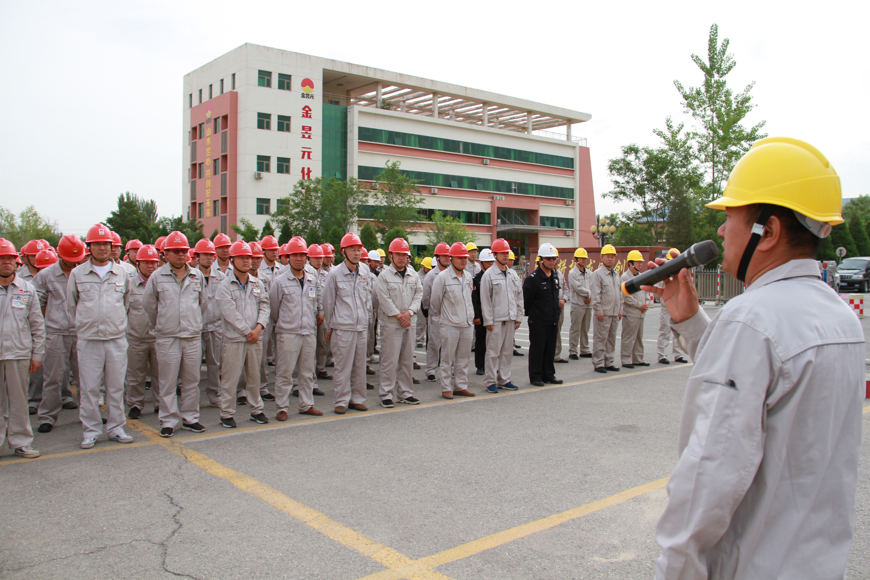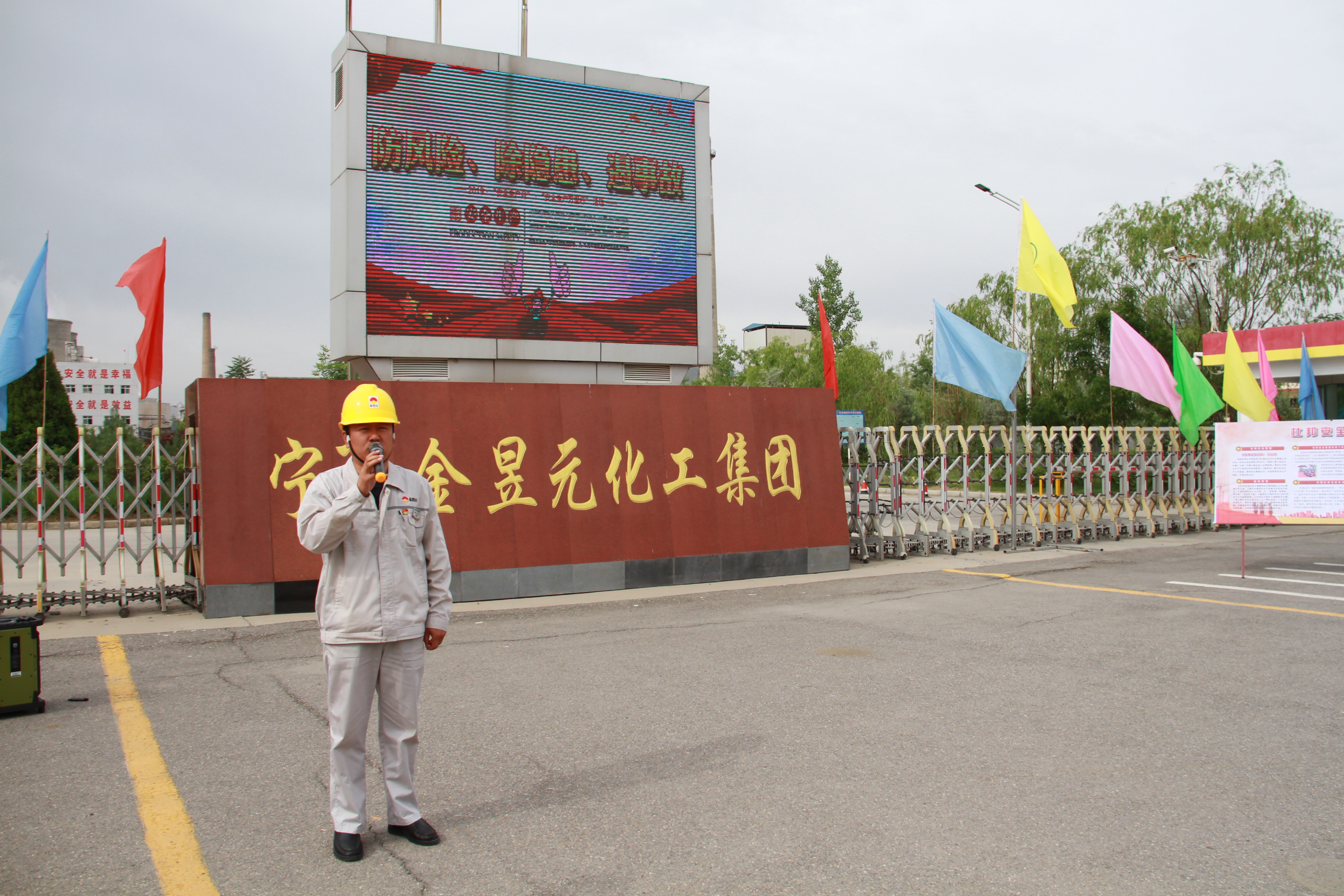 2019年6月4日8點40分許,寧夏金昱元化工集團青銅峽片區安全生產月宣傳動員及“安全生產月”活動啟動儀式即將召開。能源化學公司廠門口各色彩旗迎風招展,青銅峽片區安全生產部精心制作的一塊塊各類安全生產知識宣傳展板排列整齊一字排開,片區全體日勤人員著裝統一,列隊整齊,氣氛莊嚴肅靜。