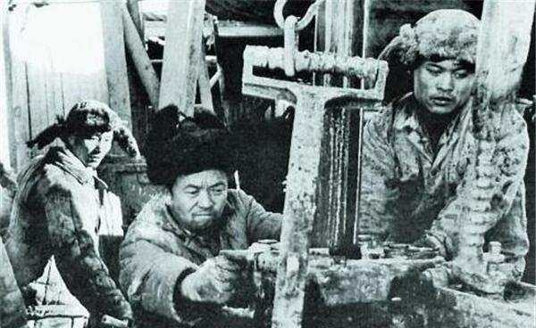 他帶領隊上的幾名工人去火車站,在鉆機沒到之前,他們就主動幫助火車站的工人卸貨、裝貨,連續干了十多天。在遼闊的松嫩平原,當得知鉆機運到火車站后,王進喜組織全隊職工不等、不靠,在沒有吊車和拖拉機條件下,硬是把60噸的四五十臺設備卸下火車,靠人拉肩扛,苦干了七天七夜,終于把40多噸重的鉆機和各種部件運到9公里外的井場。鉆機安好后開鉆沒有罐車拉水,王進喜就帶領全隊職工,從一千米外的水泡子用臉盆端水保開鉆。當1205隊打井打到700多米時,突然發生井噴。高壓液柱沖出井口二十多米高,60多斤重的方瓦憋飛十幾米高。危急關頭,鐵人當機立斷,帶領全隊職工扛水泥、運泥土,壓制井噴。但水泥和泥土倒進泥漿池后卻攪拌不開,打不進井里。突然,鐵人丟掉拐杖,拖著傷病的腿,躍進齊腰深的泥漿池,奮力用身體攪拌,周圍的隊員也相繼跳了下去……經過3個小時的緊張搏斗,井噴被奇跡般地制服了,他們每個人卻都被堿燒掉了一層皮……就這樣,王進喜吃在井場、住在井場、日夜不離開井場,有時困極了就在井場的鉆桿堆上睡上一覺,他們只用了5天零4小時,就鉆完了來大慶會戰的第一口生產井(井深1200米左右)。王進喜忘我工作的精神深深感動了房東馬大娘,她說:“你們的王隊長怎么一天不吃不喝的、也不睡覺,他真是個鐵人呀”!