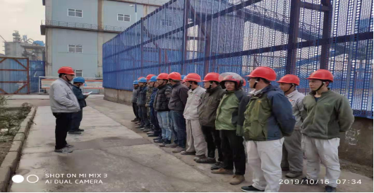 10月16日上午7時40分,成品裝置集結熟料煅燒工序、維修班人員針對回轉窯耐火磚挖補進行檢修前的動員大會。