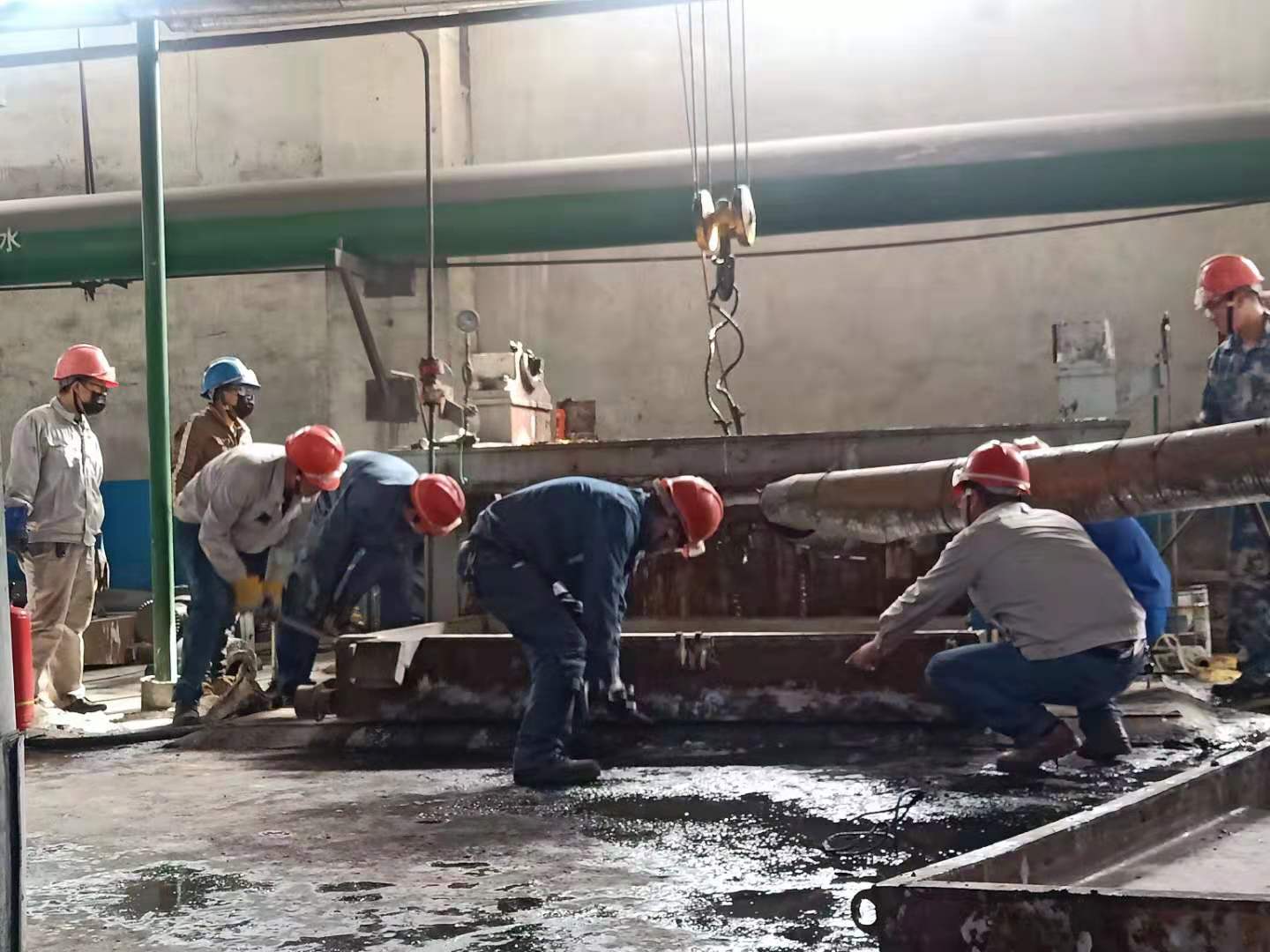 清晨,我看到兢兢業(yè)業(yè)的管理人員和朝氣蓬勃的年輕同事,他們“武裝上陣”頭戴安全帽,手帶防護(hù)手套。拿著各類方案和各類工具,快速地奔向各個(gè)檢修點(diǎn)。我看到他們忙碌的身影和為了完成檢修任務(wù)而焦灼的神情,大大小小的設(shè)備里三人一伙,兩人一組,有更換閥門的,有更換閥欄的,每個(gè)人手上、身上都沾滿了油污,他們沒有抱怨,只是默默地付出著。