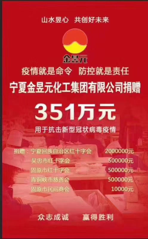 一方有難,八方支援是中華民族自古以來的優良傳統。如今我們正處于疫情防控關鍵期,社會各界都在積極統籌調配資源。寧夏金昱元化工集團也不甘落后,相繼向自治區、吳忠、青銅峽、固原捐款351萬元,向社會各界捐贈近千噸消毒液。