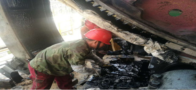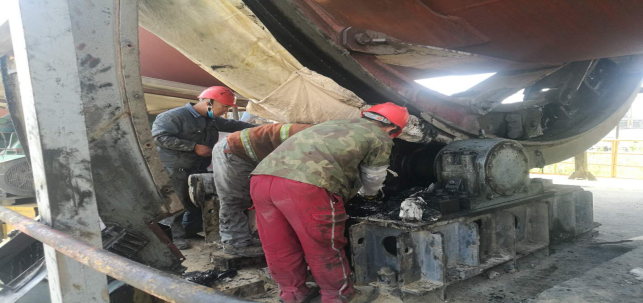 4月27日,此次回轉(zhuǎn)窯檢修已經(jīng)迎來了最后的沖刺階段。工作中最頻繁,最臟的,最累的工作任務(wù)莫過于回轉(zhuǎn)窯大齒輪更換機油及校正工作。