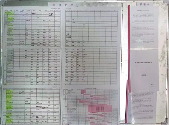 回轉窯、預熱器、烘干破高精選、1903提升機檢修是公司的檢修主線,從裝置停車到順利交付檢修后,再到單車試車,為保持工作“書面化”交流,抓好現場“痕跡化”管理,安環生產科每日嚴把檢修進度和質量,按照裝置原始開車要求,對單機試車等所有開工條件進行檢查,對現場反復進行確認。所有項目實行專人管理,表格上墻,逐臺設備,逐條管線,逐個閥門進行細致檢查,對發現的問題認真記錄,落實整改負責人及時整改。
