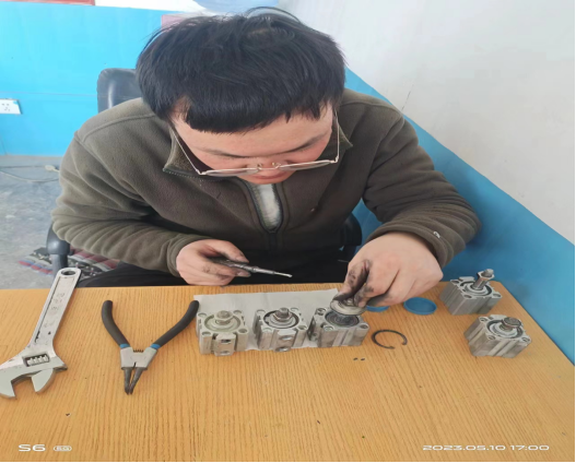 就拿水泥包裝機的小氣缸來說,它的作用就是控制包裝嘴在完成水泥包裝以后能順利的將水泥袋從包裝嘴上掉落!它就是典型的易損件,因為在水泥包裝現(xiàn)場,有一部分的灰塵是收塵器收不掉的,而包裝機屬于經(jīng)常運轉(zhuǎn)設(shè)備,時間久了,小氣缸由于暴露在灰塵中,會有一部分灰塵通過電磁閥連接的氣道而進入小氣缸內(nèi)部,造成內(nèi)部活動件的卡死,如果活動件卡死不動作,小氣缸就會壞掉,因此需要我們經(jīng)常維護保養(yǎng)和更換!近期,班組人員積極響應公司的廢舊利用理念,將一些不好用和損壞的小氣缸收集一起,進行拆卸清理,重新再組裝,經(jīng)過反復的試驗,變成小氣缸的備件,這樣的一個小小舉動,其實為公司節(jié)約了一小部分成本,如果長期這樣,大家一塊行動起來,每年為公司節(jié)約的成本是顯著的,也是讓人內(nèi)心激動的。