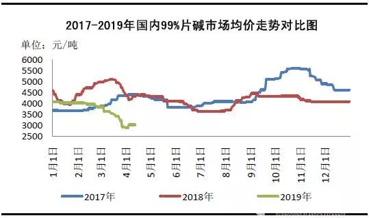 圖1 2017-2019年國內99%片堿市場均價走勢對比