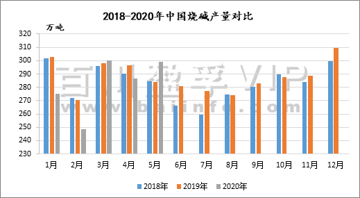 根據百川統計數據,2020年1-6月燒堿折百產量約1685.7萬噸,同比下滑2.9%。