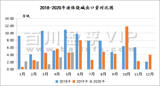 量上面,2020年1-5月中國液體燒堿共出口13.8萬噸,相比于2019年1-5月出口量18.8萬噸,下滑26.6%;