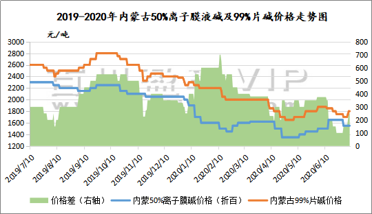 如上圖,可以明顯看出,從2019年至今,99%片堿與50%離子膜液堿折百價格差有不斷縮減趨勢,這意味著片堿行業利潤下滑,2020年上半年中國片堿市場價格大幅下滑,跌落至近十年的歷史低位。