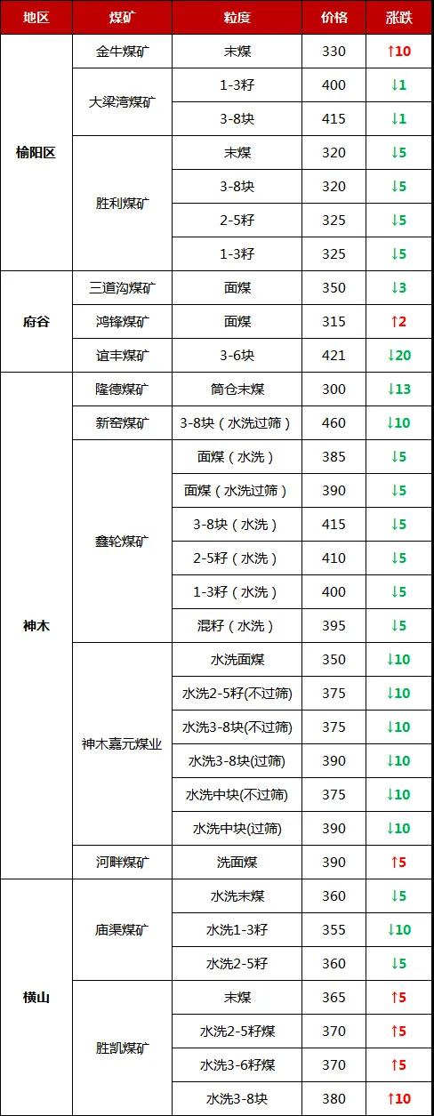 今日調整價格的煤礦有: