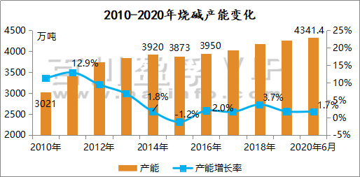 燒堿市場行情走勢與市場供需情況往往存在密切的聯系,而供應方面的變化主要來自于產能的改變,今日我們百川從供應角度分析2010-2020年燒堿產能變遷情況;2010-2015年中國燒堿處于飛速擴展,供應的激增導致產品價格偏低,2013年開始廠家擴產趨于理性,2015年中國燒堿產能增長率為-1.2%。