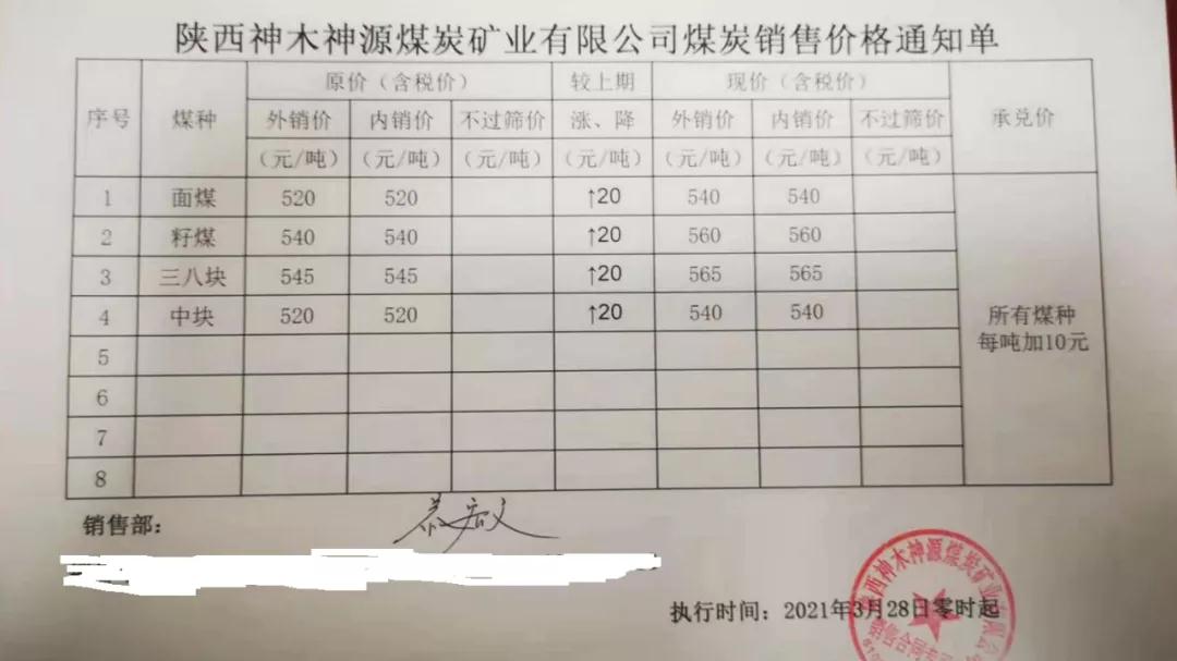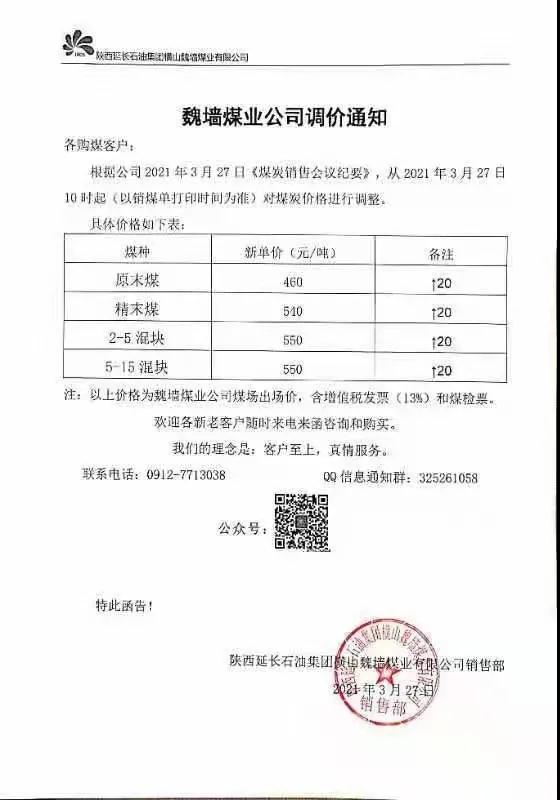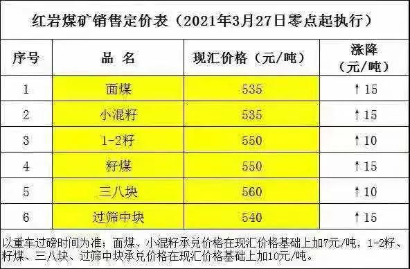 府谷縣老高川鄉(xiāng)恒益煤礦3月27日上午10:00:00時起,面煤、次精煤、二五籽、四九塊各漲價(jià)10元/噸。