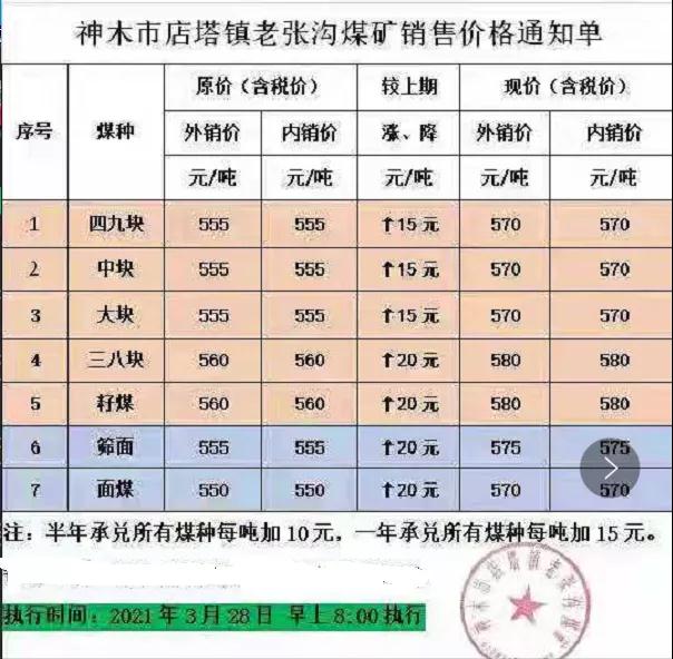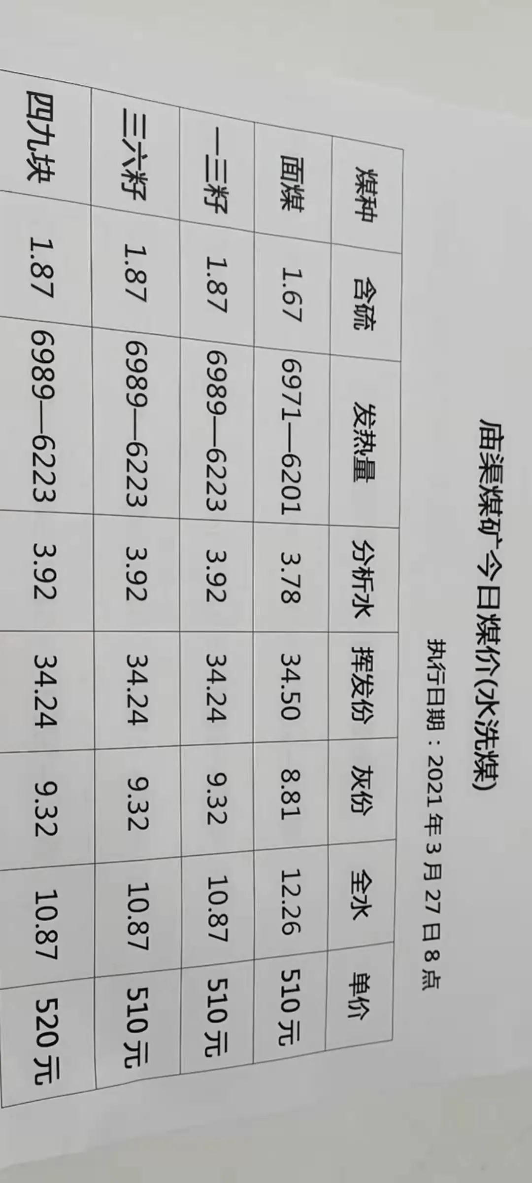 2021年3月28日早7點(diǎn)大砭窯煤礦:面煤漲80元,所有塊煤漲價(jià)40元。
